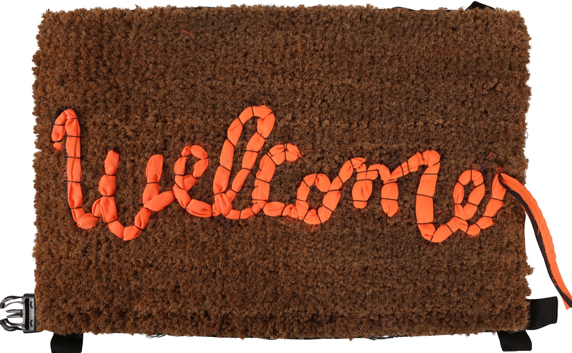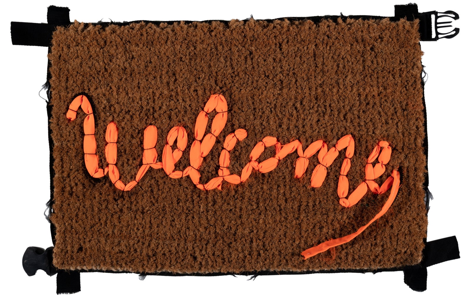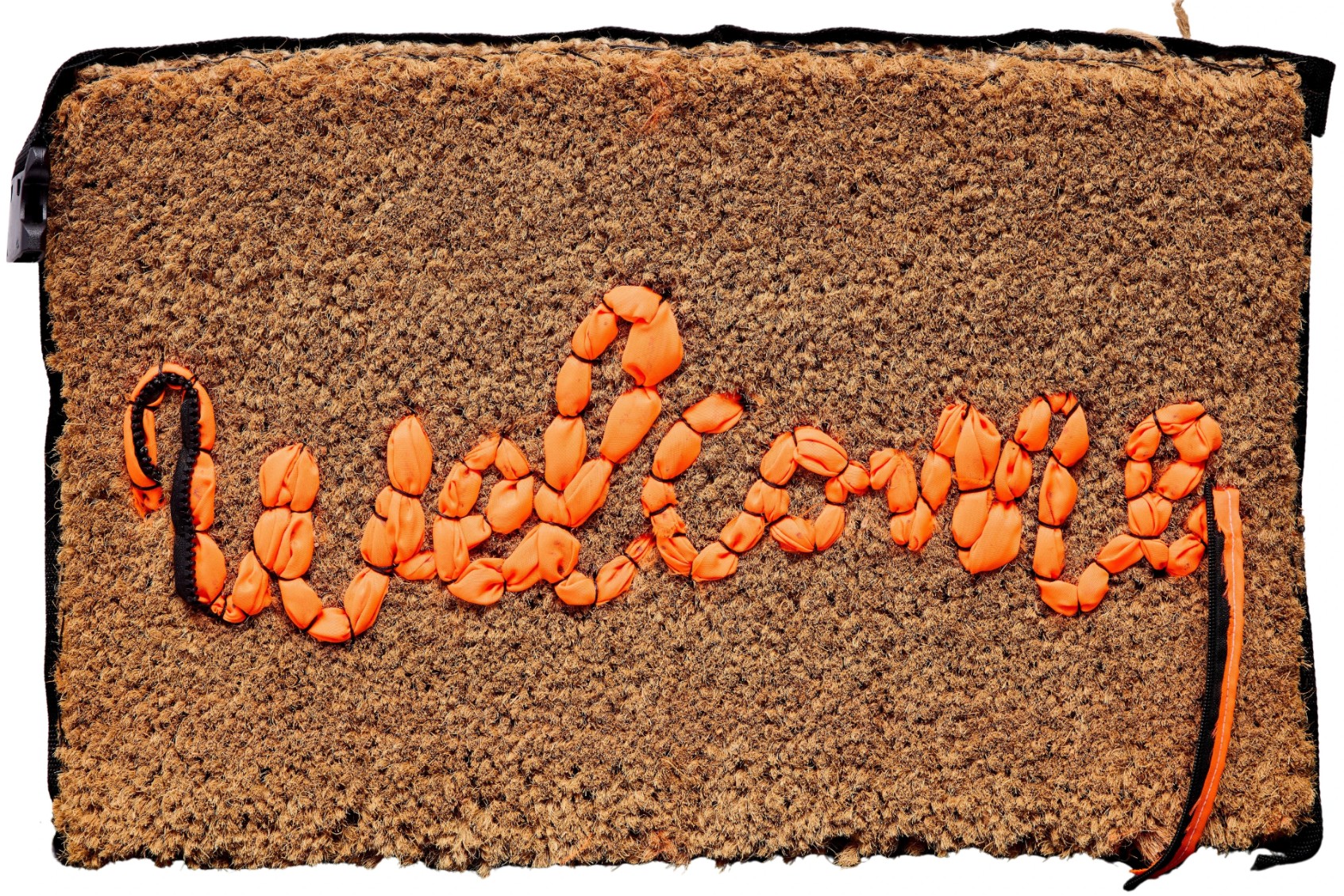 Hand stitched welcome mat, the lettering made from the salvaged fabric of migrants’ life jackets abandoned on Mediterranean beaches fabricated at Greek refuge camps