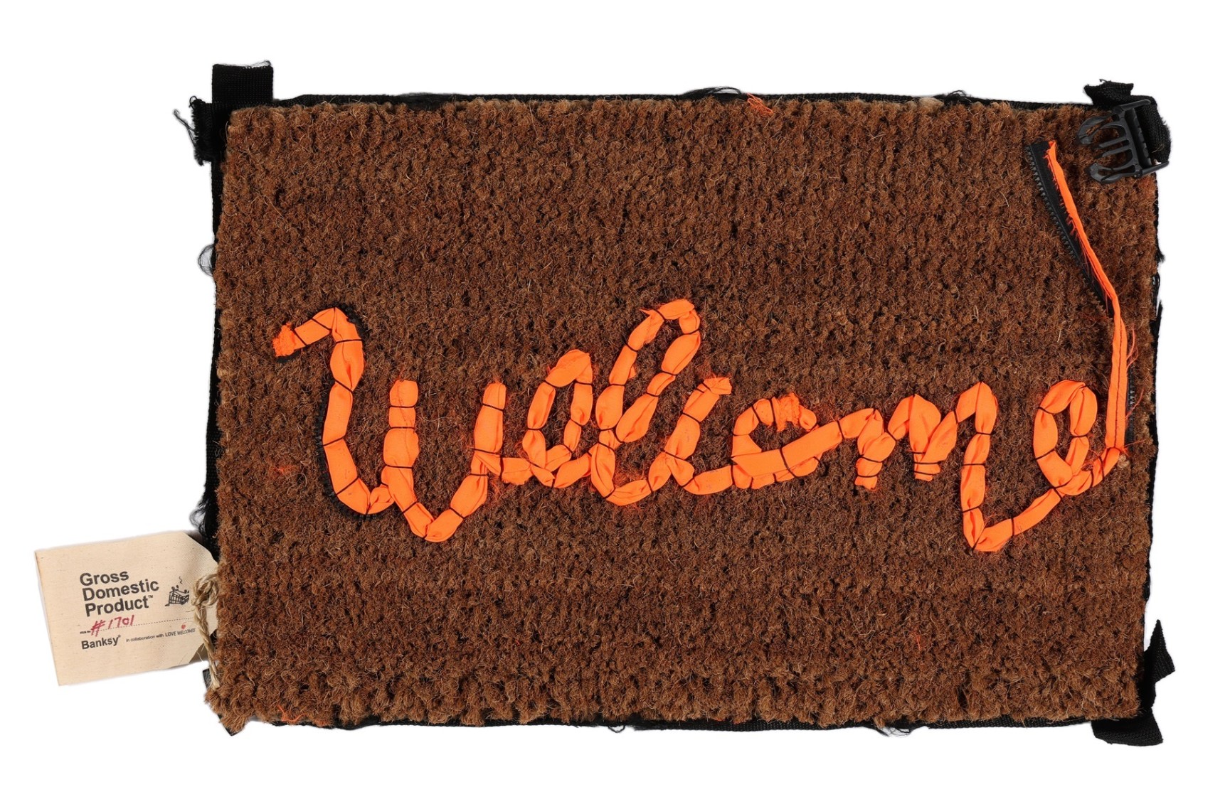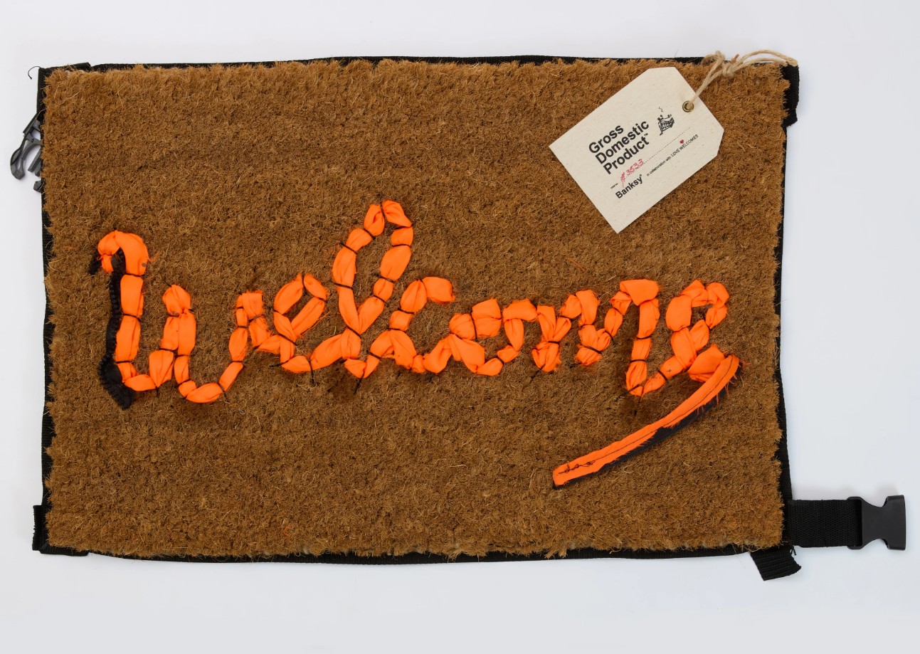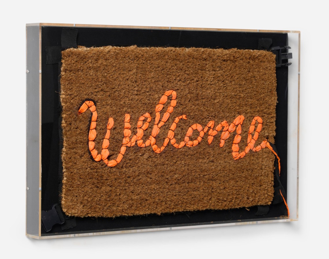 Hand stitched welcome mat, the lettering made from the salvaged fabric of migrants’ life jackets abandoned on Mediterranean beaches fabricated at Greek refuge camps