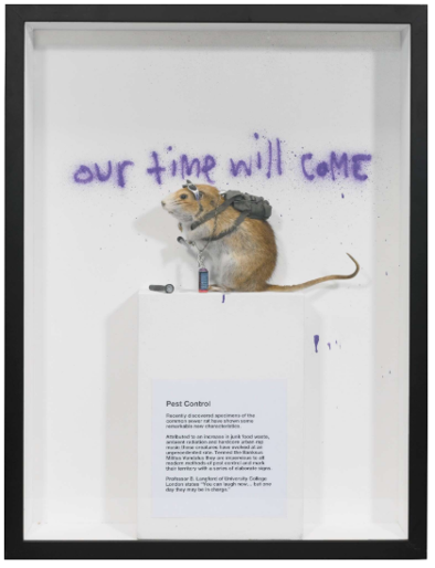 The rat wears sunglasses and a complete graffiti kit. Apparently, he has sprayed “Our time will come” on the wall behind him. The installation came with a printed explanation titled “Pest Control.” A few years later, Banksy set up his own certification office naming it “Pest Control Office.”