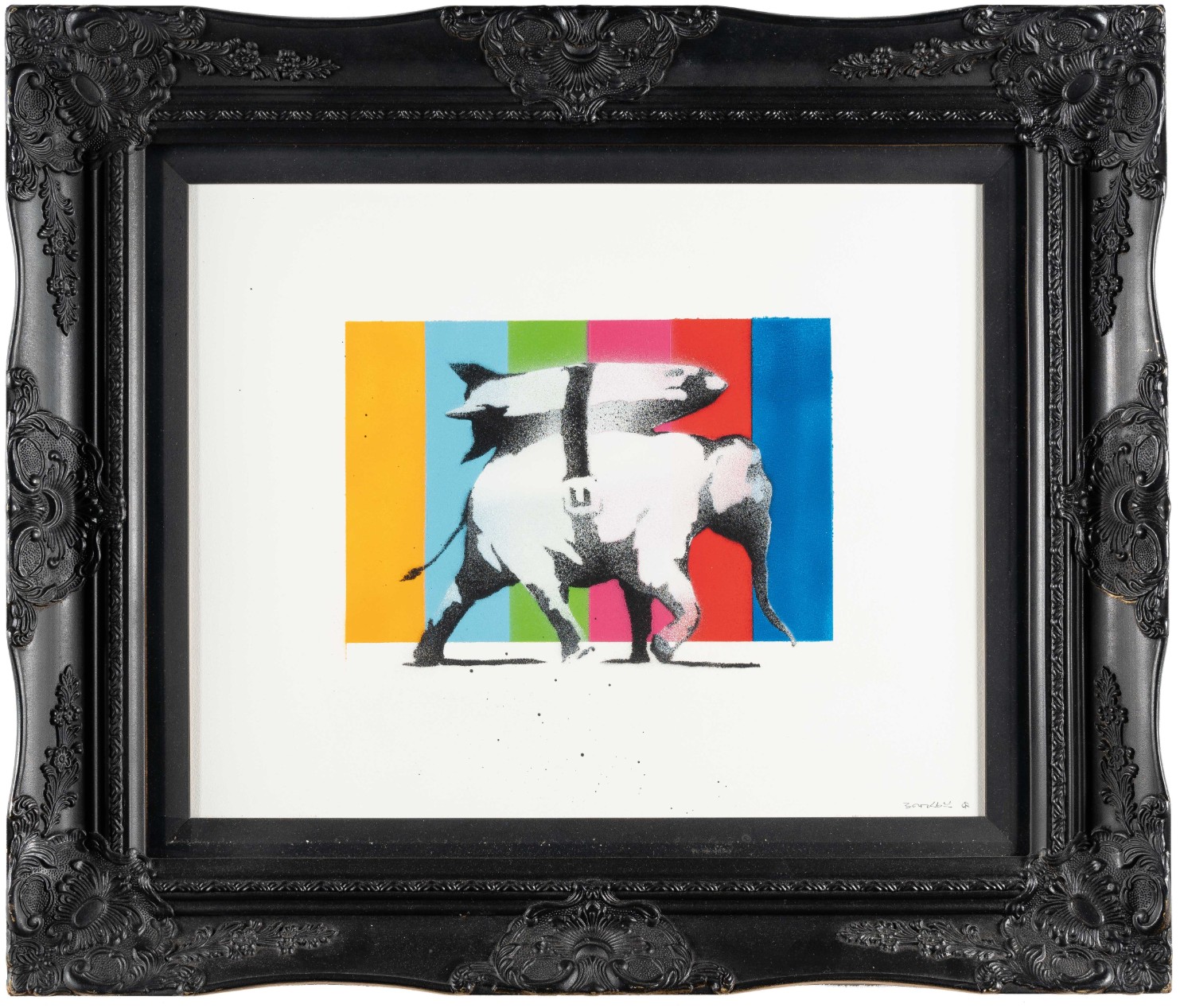 Stenciled with the artist’s name ‘BANKSY’ on the lower right turnover edge