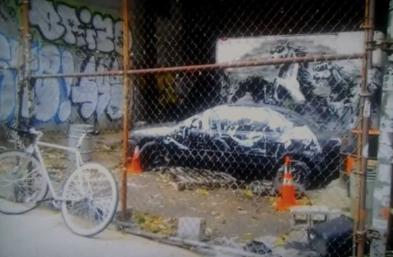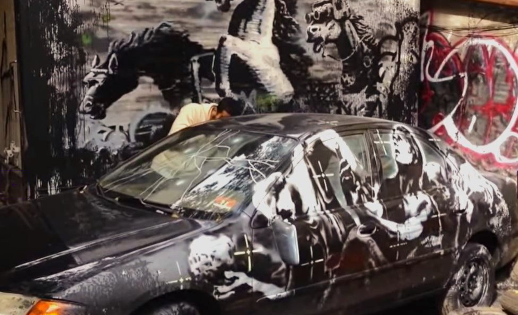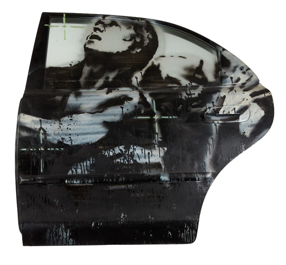 An original Banksy aerosol painting executed on a car door, from the art installation “Crazy Horse.”