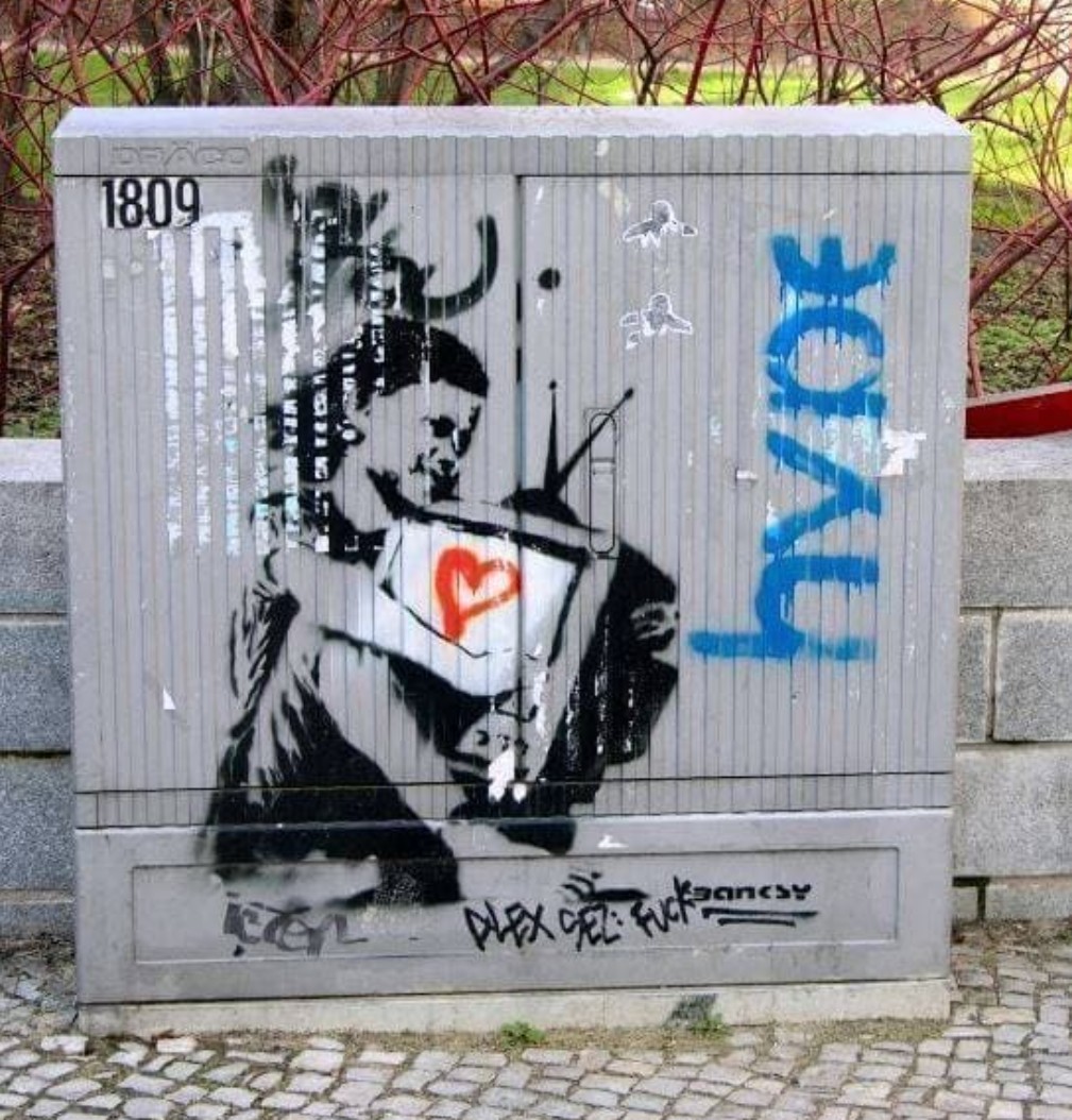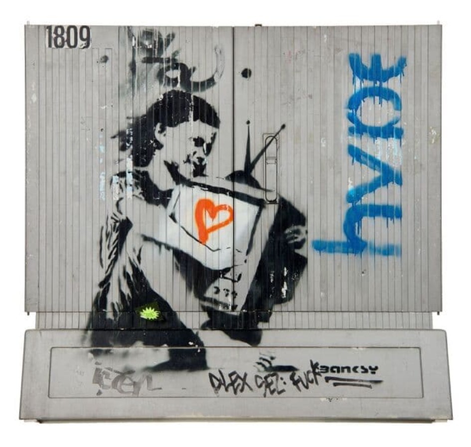 Executed by Banksy during his German tour of 2003/2004 (prior to the formation of Pest Control) on the door panels of a “Draco” transformer box originally located at a park on the corner of Gipsstrasse and Joachimstrasse in Berlin-Mitte. Signed by Banksy to lower right. With works by additional street artists, including a sticker reading “Kunst für Alle” (Art for All), a stenciled tag reading “Hype,” and an obscene remark directed specifically at Banksy.