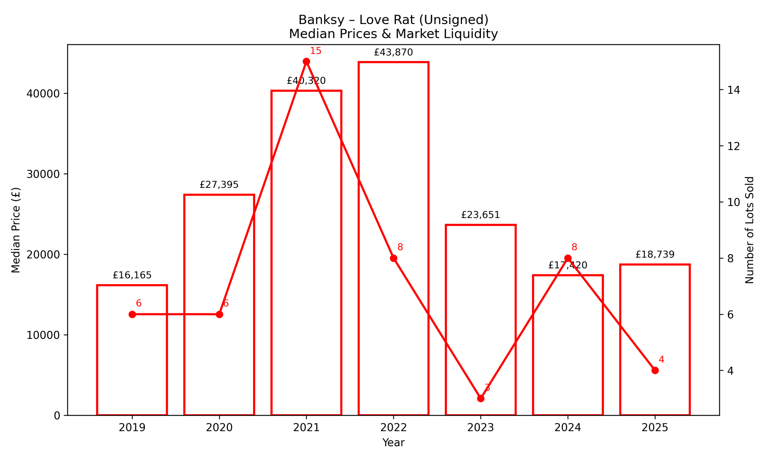 The auction history of Love Rat (unsigned) illustrates a textbook speculative cycle. Between 2019 and 2022, median prices rose sharply, supported by a surge in transaction volume that peaked in 2021. This phase reflects heightened demand for accessible Banksy icons during the post-pandemic expansion of the print market, culminating in a price high in 2022 despite already declining liquidity.