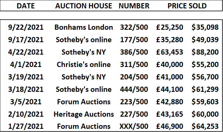 Morons (unsigned) sold 4 times at auction in 2021 at an average price of GBP 44,898 (USD 62,289). It sold at Forum Auctions on 2 September 2021 for GBP 48,240 (USD 67,054), its world auction record.