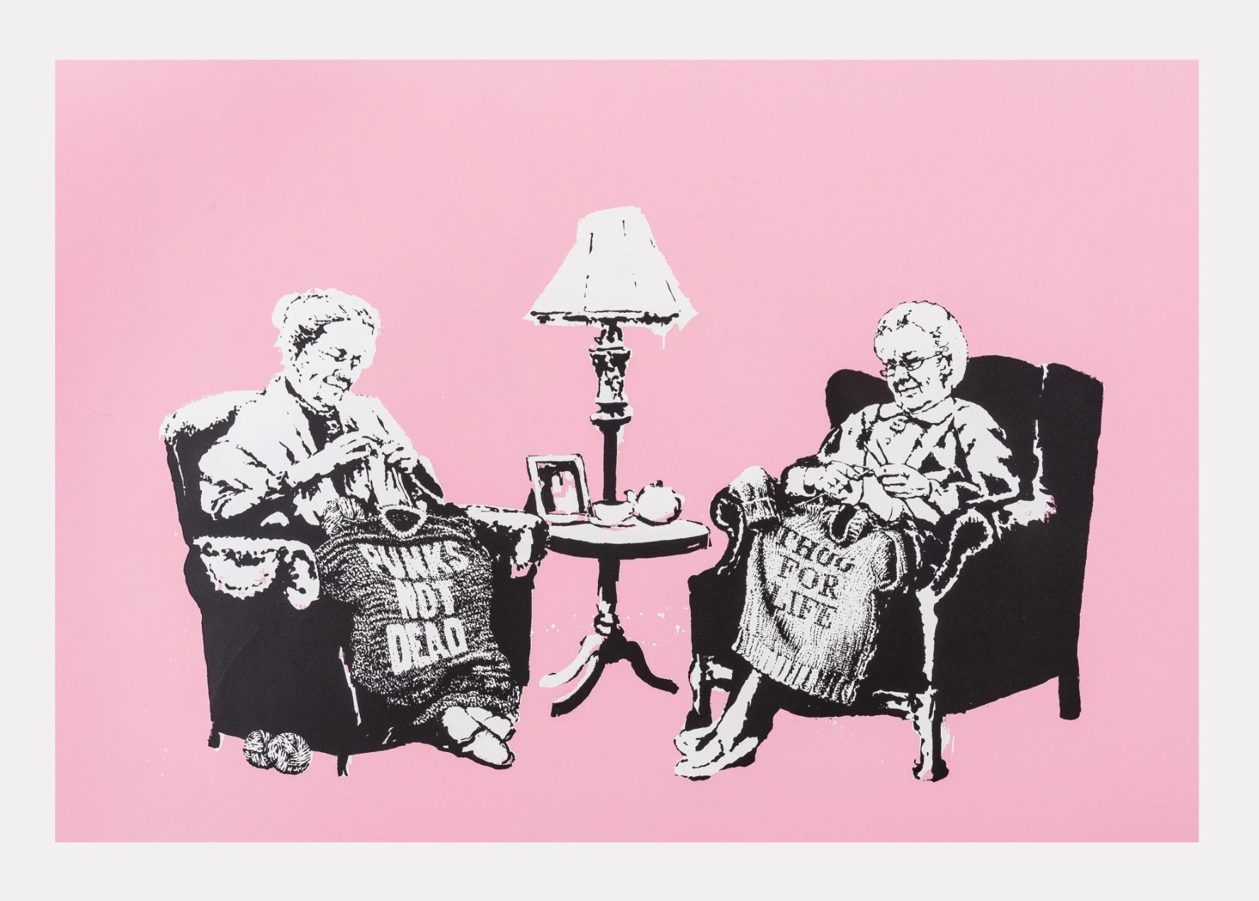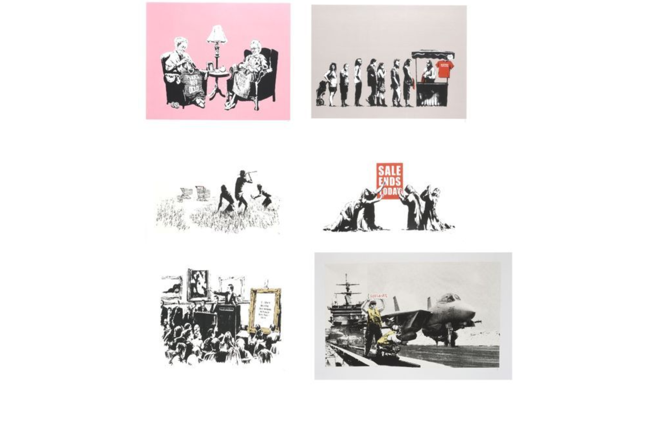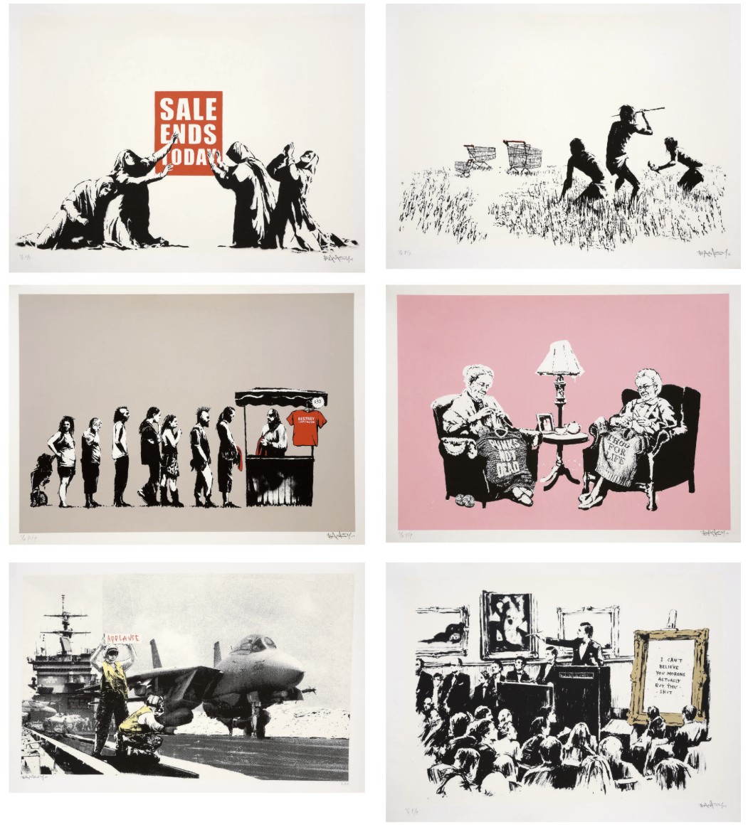 Only 100 unsigned from the 500 unsigned editions have been printed by Modern Multiples of Los Angeles and sold during the Barely Legal Exhibit, the remaining prints from the unsigned editions were printed by Pictures on Walls in 2007 with various differences, including various colorways. Banksy also released 6 signed Printer’s Proofs (PP) for each print. Very few sets are still intact.