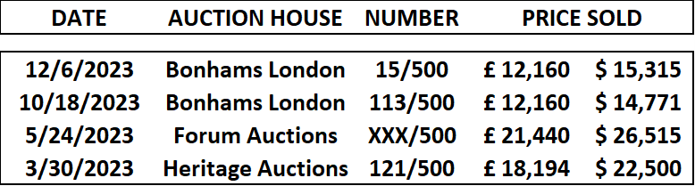 Morons (unsigned) sold 3 times at auction in 2023 at an average price of GBP 24,160 (USD 29,840). It sold at Sotheby’s online on 20 April 2023 for GBP 25,400 (USD 31,169), its highest price for 2023.