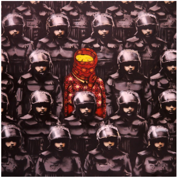 This installation is most probably the most political and innovative piece created by Banksy during his New York residency. It presents a complex visual dynamic with armed men in gun sights, horses wearing night vision goggles, together with a free phone number to hear the audio of an air strike.