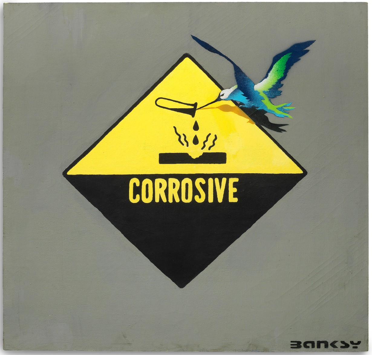 Corrosive Bird comes from the heart of Banksy’s most dynamic period as a studio artist, when the street pieces began to translate into the interior sphere. A formative phase of the artist’s career it also coincides with his move from Bristol’s hotbed of creative innovation and the birthplace of British Street Art to the London’s Metropolis and its greater, international reach. Having been surrounded by figures like 3D (also of Massive Attack fame) and Inky in Bristol, Banksy teamed up in London with Jamie Reid, an artist whose perspective chimed so clearly with his own for the project ‘Peace is Tough’ at the Arches in Glasgow in 2001. Reid’s work for the band The Sex Pistols and his iconic cover for the album Never Mind the Bollocks is the epitome of the punk attitude that was running through the veins of street culture in the early 2000s, and a baton that Banksy has taken on with such verve and authenticity.