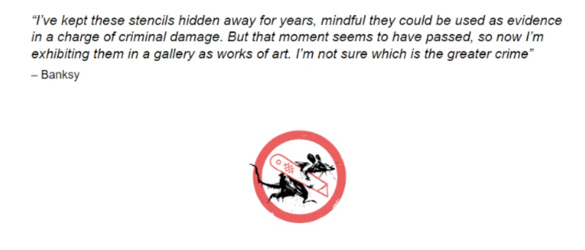 Yet this time, the joke was doubled. By displaying his tools of the trade, once hidden to avoid legal repercussions, Banksy wittily transformed potential evidence into museum artifacts. It was confession-as-exhibition, with a wink.