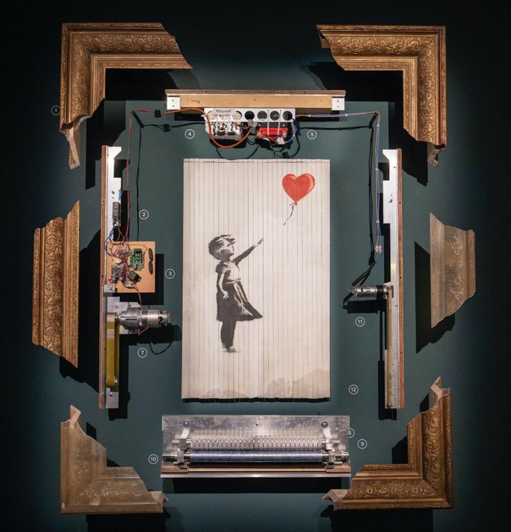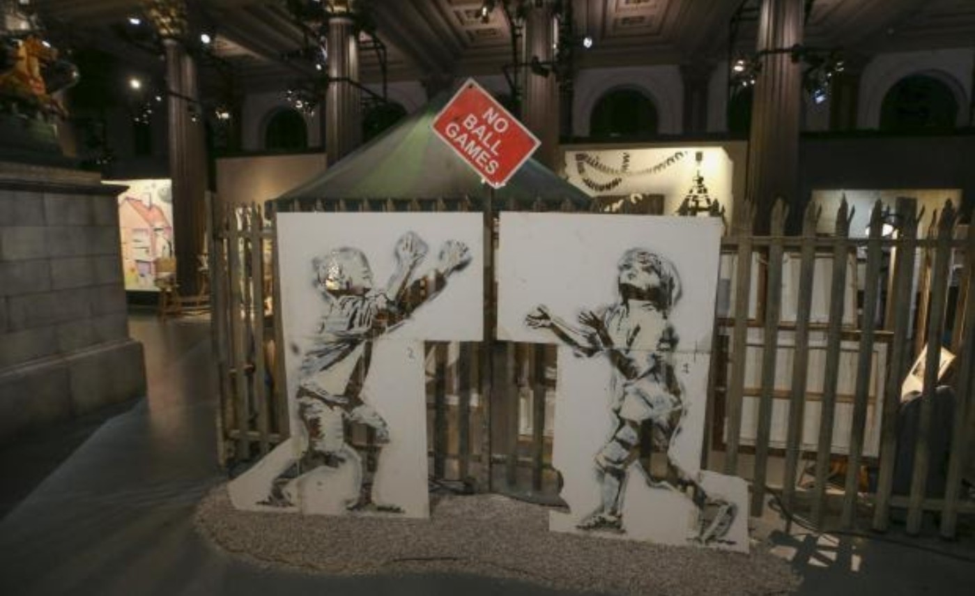 Among the standout exhibits were the prototype of Stormzy’s Union Jack stab vest (first seen at Glastonbury 2019) and a revamped version of the iconic Kissing Coppers. Girl With Balloon (or rather its mechanical innards) made a mechanical, mischievous cameo.