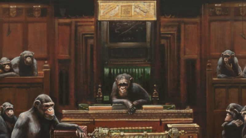 BANKSY Devolved Parliament, 2009 Oil on canvas 250×420 cm (98 3/8 x 165 3/8 inches) Signed and dated “09” on the reverse and variously inscribed on the stretcher Provenance The Artist Acquired from the above by the present owner in 2011 Exhibited Bristol, Bristol Museum & Art Gallery, Banksy versus Bristol Museum, June – August, 2009 … Continue reading Devolved Parliament, 2009