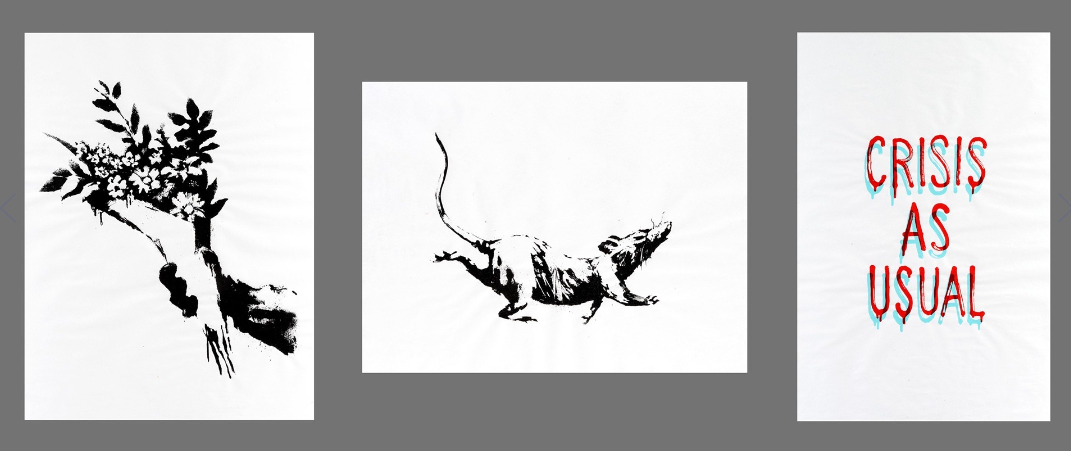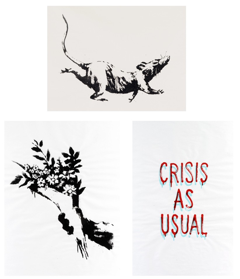 If the first two works operate through image, GDP Crisis As Usual speaks directly through language. The phrase, rendered in Banksy’s characteristic hand-painted typography with a slight chromatic misalignment, reads at first like a familiar expression. Only upon reflection does it reveal its inversion.