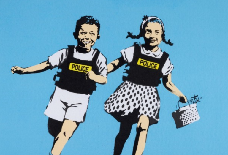 A Study in Innocence, Protection, and the Militarisation of Childhood “A lot of parents will do anything for their children, except let them be themselves.” With Jack and Jill, also known as Police Kids, Banksy constructs one of his most unsettling images of childhood. At first glance, the work appears light, playful, even idyllic: two … Continue reading Police Kids, 2005