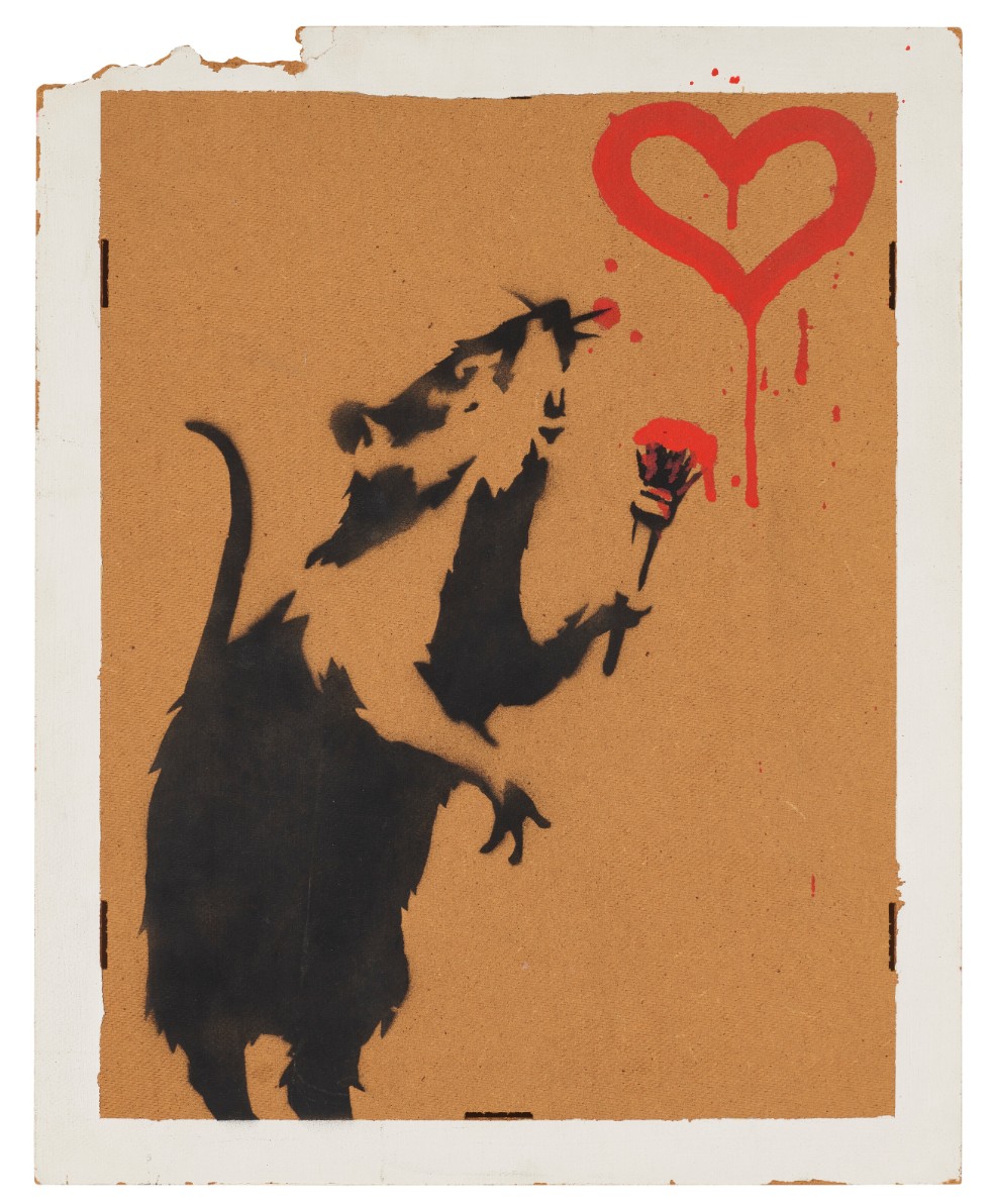 Acquired directly from the artist the year it was made, Love Rat (White Border) (2002) is one of the few original and unique stencil paintings by Banksy to feature a rat. Instantly recognizable, the rodent’s monochrome silhouette is finely detailed with a whiskered nose, long pointed teeth and curved tail. Standing on its hind legs, it wields a small paintbrush in its paw and seems to have just made a gestural mark of its own—the crude, freshly painted outline of a love heart. One of his favourite and most prolific subjects, the rat has appeared in Banksy’s work in more than thirty different iterations since the early 2000s: Gangsta Rat, Placard Rat, Radar Rat, and Paparazzi Rat to name a few. As one of the earliest, Love Rat holds a prestigious rank within the colony. It appeared in situ as a mural in Liverpool and would later be chosen as the first of the artist’s series of rat prints to be released in 2004, promoted as the perfect gift for a cheating spouse. Regarded as pests and carriers of disease, this rat’s offering of love—blood-red and dripping—is offset with a characteristically derisive twist.