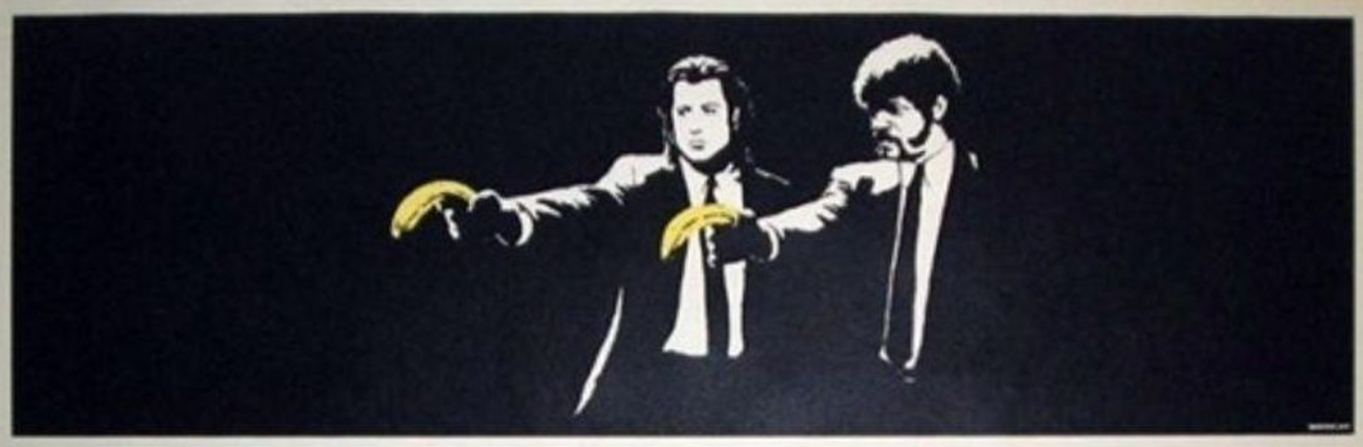 When the banana reappears in contemporary works, most notably in Banksy’s Pulp Fiction, it carries this entire lineage with it. It is no longer just a humorous replacement or an absurd prop. It becomes a reference, almost a shorthand, for a moment in art history when everyday imagery was redefined as a site of meaning. I By inserting bananas into a scene defined by violence, Banksy creates a layered substitution. Guns are replaced not simply by something harmless, but by something deeply embedded in the history of art and mass culture. The work shifts from a cinematic reference to a dialogue between pop art and street art.