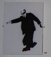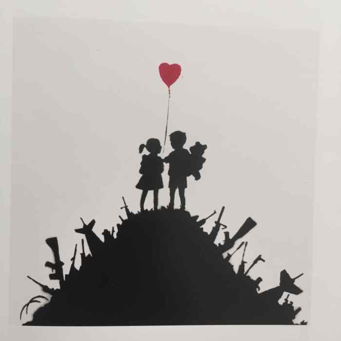 Banksy released numerous editions on canvas at Santa’s Ghetto in December 2003, including Gangsta Rat, Love Is In the Air, Kids on Guns, Lenin on Roller Skates, Petrol Bomb, Winnie the Pooh, and Mosquito.