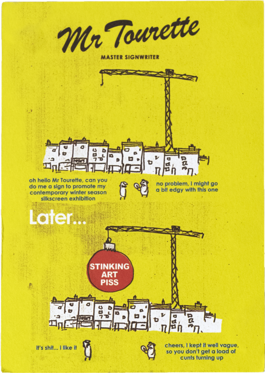 Works by Mark Jenkins, Ericailcane (eric the dog), Emma Heron, Peter Kennard and Kat, Ben Turnbull, Antony Micallef, Tom Ormond, Banksy, Simon Munnery, Tittifreak, Eine, David Shrigley, Jamie Hewlett, Pete Fowler, Kelsey Brooks, Tinsel Edwards and Space Invader were on display and available for sale.