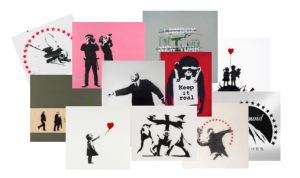 A mix between Banksy’s iconic Girl with Balloon, and his none less iconic Love Is In The Air stencil resulting in an explosion of flowers!