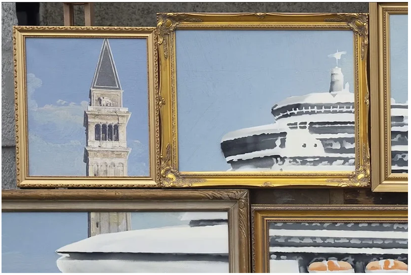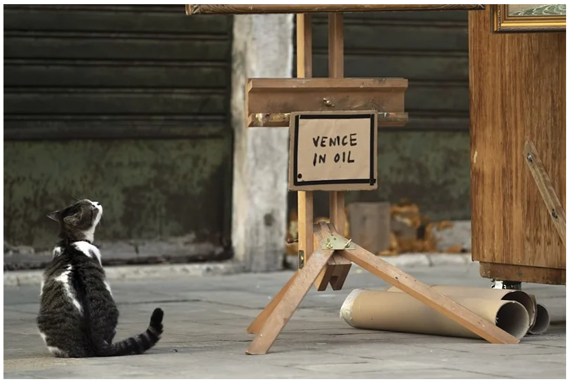 Indeed, the minute-long video shows a concealed man setting up what looks like an installation of various framed oil paintings in the street, on the sidewalk, amongst other artists and souvenir vendors for tourists. This selection of “Venice in Oil” seems like a right fit for the romantic city, populated by various gondolas.